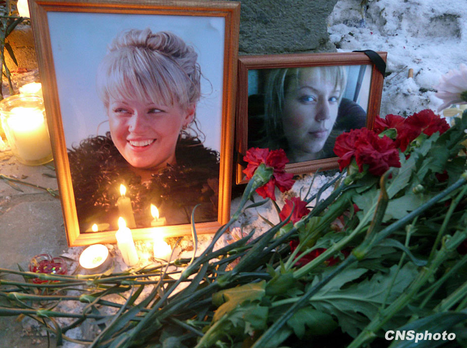 十二月六日,在俄罗斯彼尔姆市夜总会火灾事故现场,首次出现了遇难者的遗像。中新社发 田冰 摄