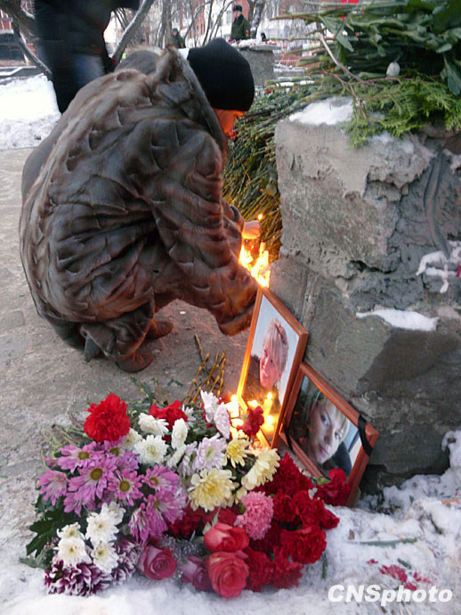 十二月六日,在俄罗斯彼尔姆市夜总会火灾事故现场,一位俄罗斯妇女点燃蜡烛,悼念自己的亲人。中新社发 田冰 摄
