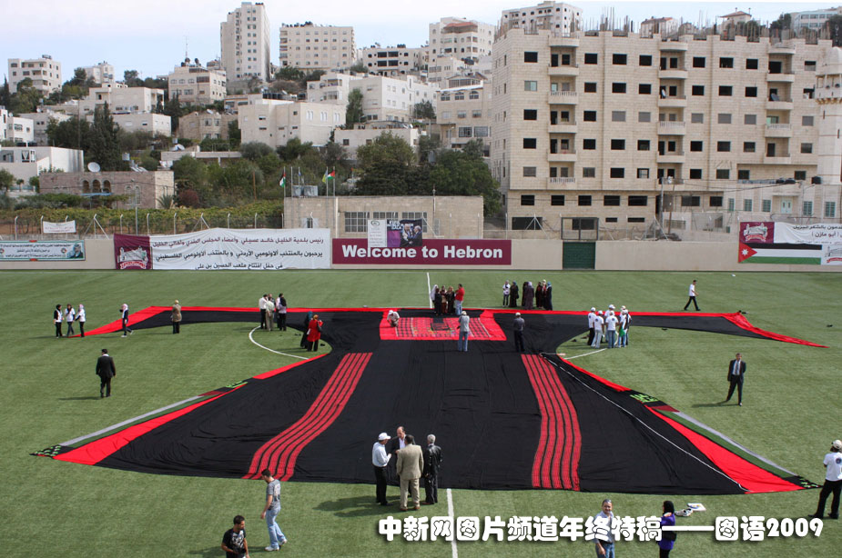 世界最大的球衣:10月25日,巴勒斯坦人利用传统刺绣工艺制作了世界上最大的球衣,并获得了吉尼斯纪录的认可。图片来源:中国新闻网