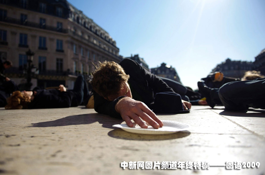 10月15日,示威者身穿黑色衣服、手持空盘子在巴黎歌剧院前抗议。他们此举是为了呼吁人们关注世界上的饥民。