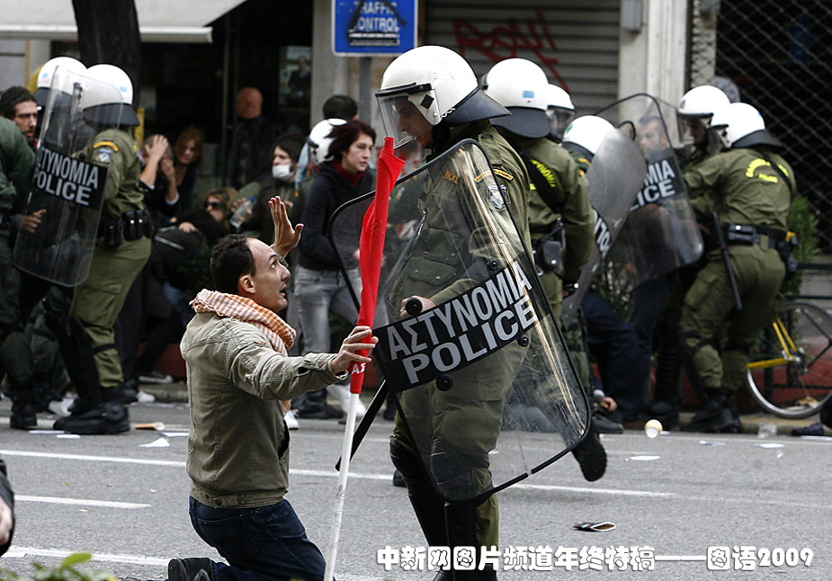 12月6日,一名抗议者在警察面前下跪。雅典警察开枪打死一名15岁少年事件一周年,希腊各地举行悼念活动和爆发游行示威。