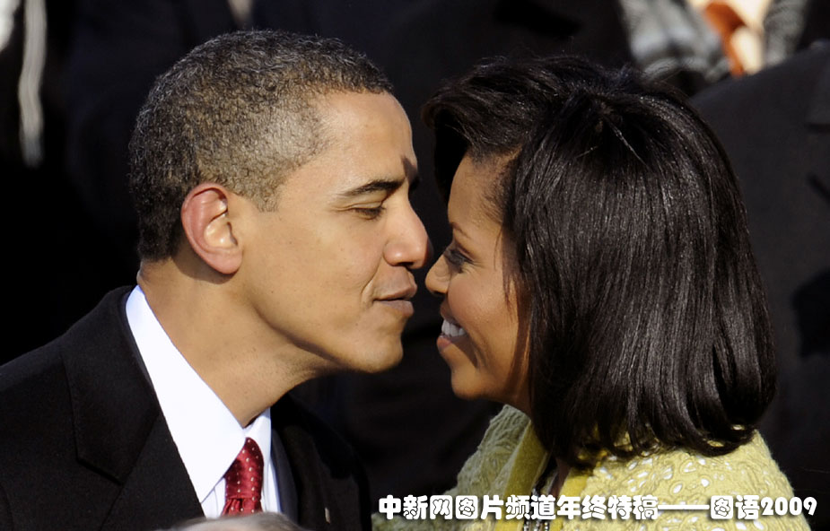 甜蜜的奥巴马:2009年1月20日上午12点05分,四十七岁的奥巴马在华盛顿国会山宣誓就职。当就职仪式结束后,奥巴马深情亲吻妻子。