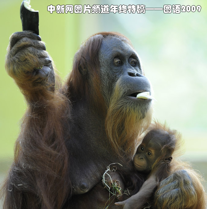德国慕尼黑的一家动物园里,一只红毛猩猩怀抱着它四个月大的“宝宝”。