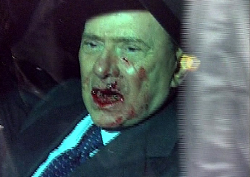 意大利总理贝卢斯科尼13日晚间受邀在米兰参加一个集会时遭到袭击,面部受伤流血,随后被紧急送医治疗。图片来源:中国新闻网