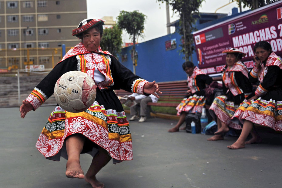 12月12日,秘鲁印第安妇女在利马国家体育场外举办了一场特别的足球赛,所有的球员均身着传统服饰光脚上阵妙趣横生。图片来源:中国新闻网