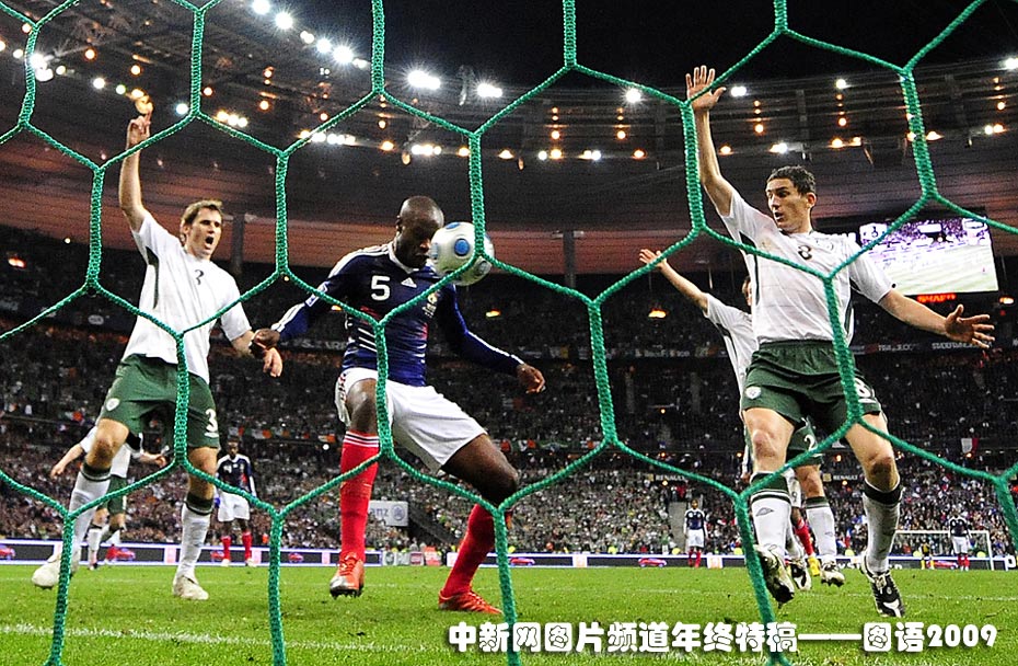 2010年南非世界杯预选赛法国对爱尔兰第二回合的比赛周三在法国圣德尼举行,在加时赛中,法国队球员关键时刻的一记“手球”逃过裁判的眼睛,帮助后卫威廉·加拉成功破网,两队打成1:1平局,法国队淘汰爱尔兰第四次晋级世界杯决赛。图为,在加拉射门时,爱尔兰队队员举手示意有犯规动作。