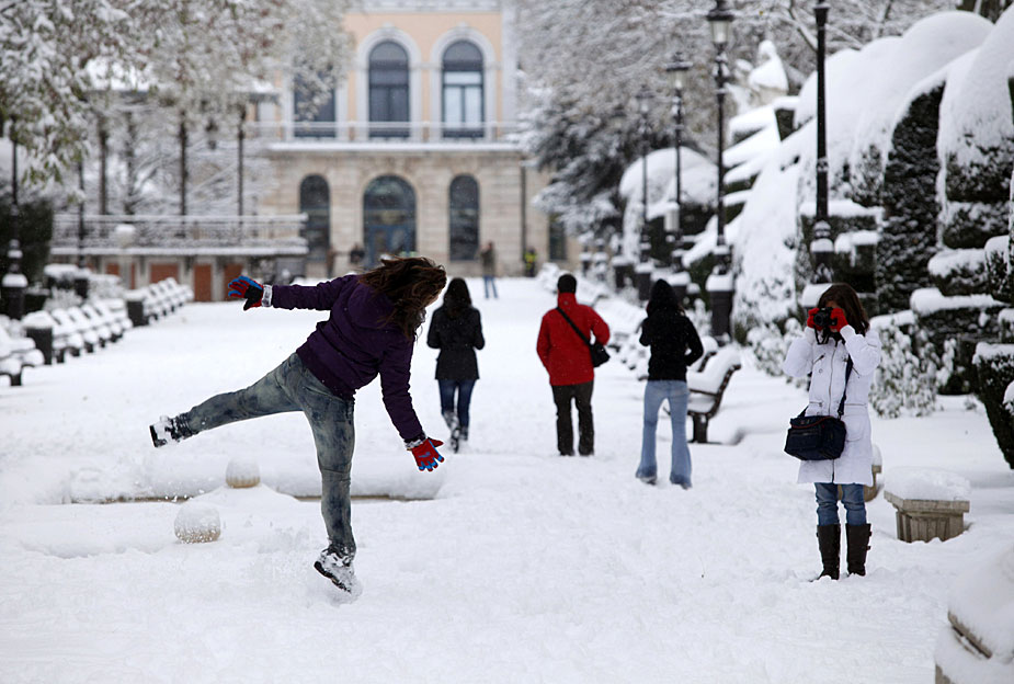 12月17日,西班牙布尔戈斯人们在雪中拍照留念。