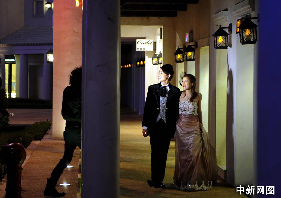 澳门新人在渔人码头夜色中拍摄婚纱。中新社记者 廖攀 摄