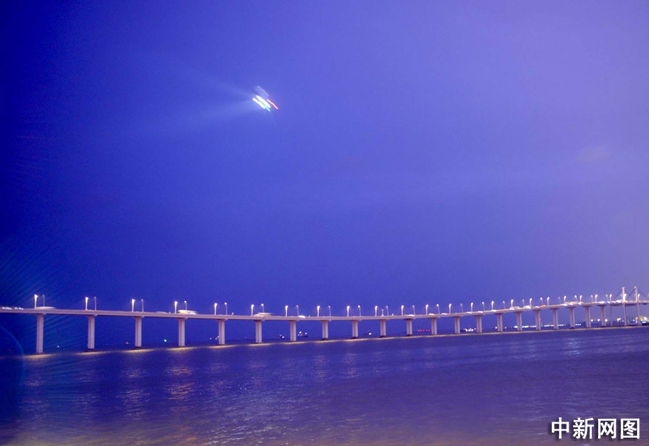 直升机飞过澳门友谊大桥。中新社记者 廖攀 摄