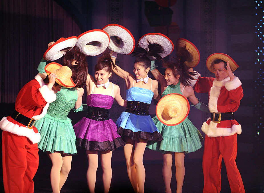 12月19日,在日本东京一家剧院,身着圣诞老人服装的退役的奥运会选手参加“肌肉音乐剧”预演,展示其过人的身体素质与运动技巧。图片来源:中国新闻网