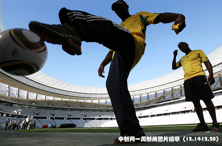南非开普敦的新体育场竣工仪式在14日(周一)举行,图为球迷们在仪式上进行表演。该体育场是为明年南非足球世界杯而建,可容纳6.8万名观众。图片来源:中国新闻网