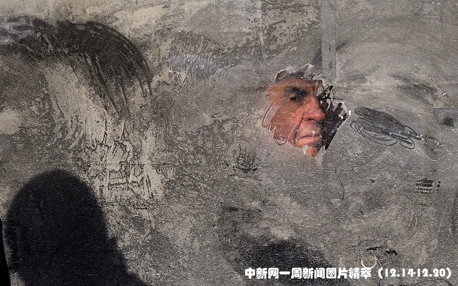 15日(周二),乌克兰首都基辅的气温降至摄氏零下16度,图为一名男子在公交车上透过结冰的车窗往外看。图片来源:中国新闻网