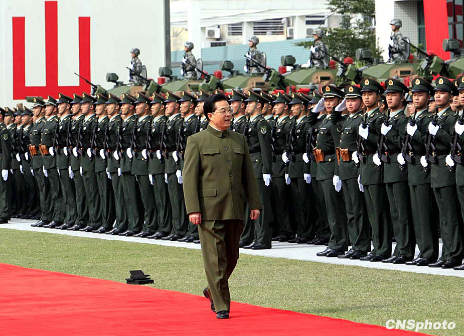12月20日,中共中央总书记、国家主席、中央军委主席胡锦涛检阅驻澳部队。驻澳部队司令员王玉仁陪同检阅。中新社发 张勤 摄