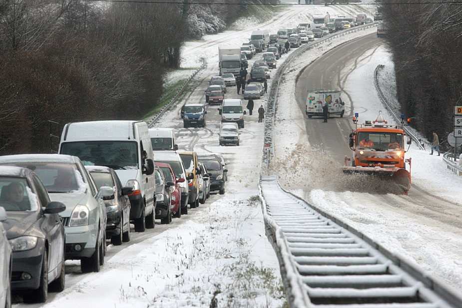 图为12月18日,大雪导致法国圣约瑟夫地区出现严重堵车。