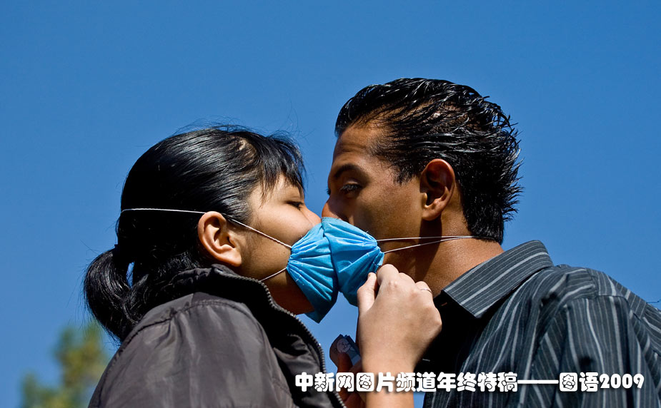 2009年4月29日,在甲型H1N1流感肆虐的墨西哥,一对情侣戴着口罩亲吻。