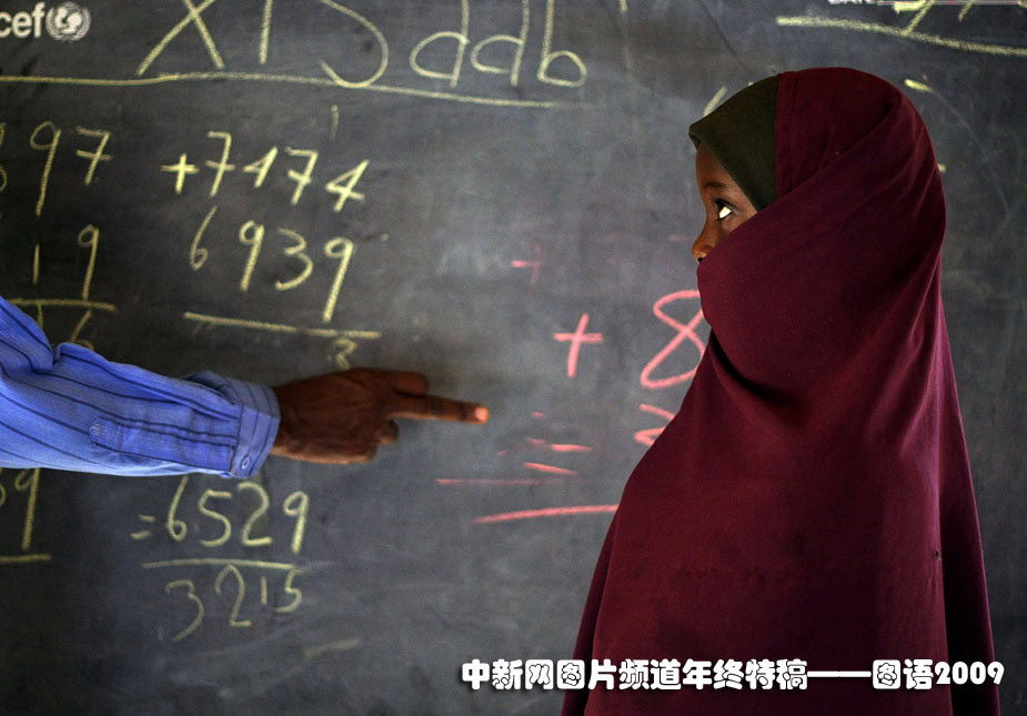 2009年6月15日,一位流离失所的女孩在索马里的一个难民营内上课。