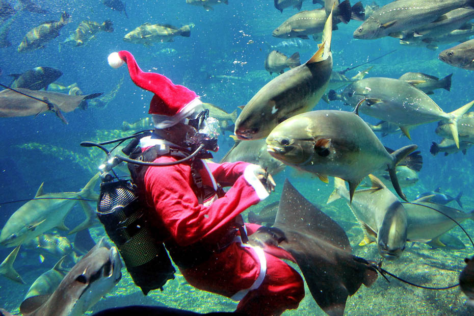 图为迪拜海底世界主题公园内一个身着圣诞老人服装的饲养员在水中喂食。
