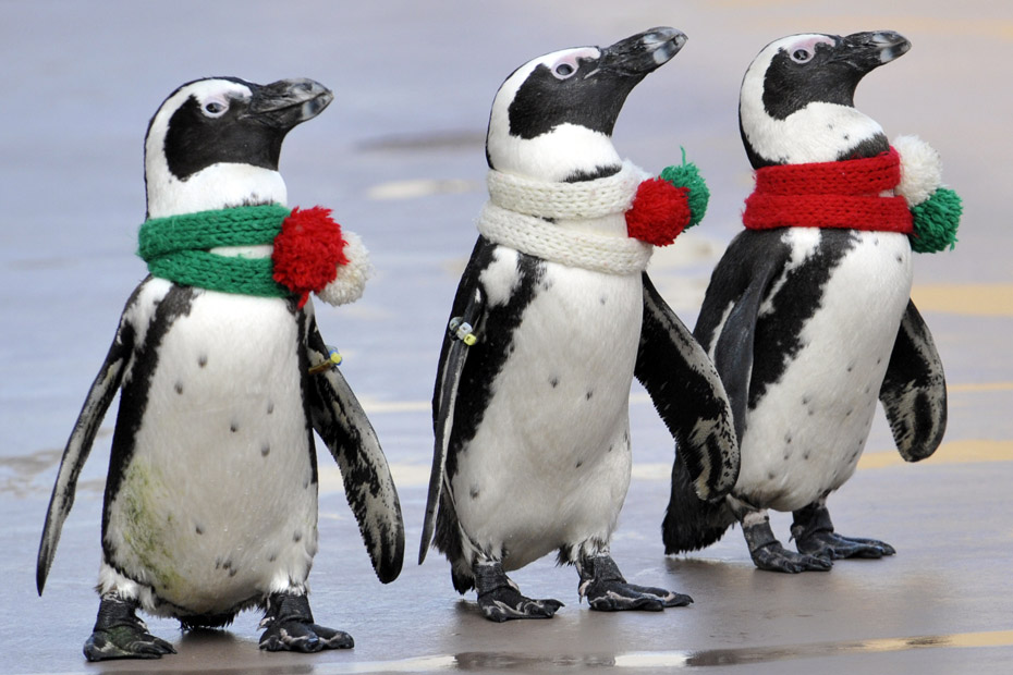 图为东京横滨八景岛海洋乐园的企鹅披着圣诞围巾在路边行走。