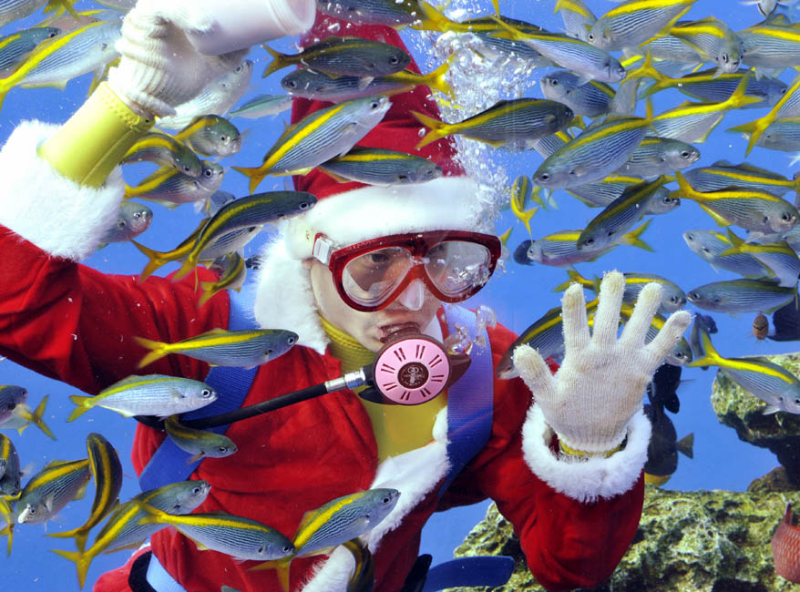 图为东京横滨八景岛海洋乐园的潜水员着圣诞服饰潜入水中。