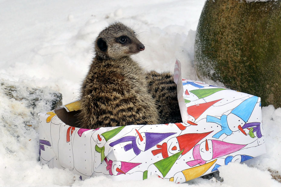 图为德国北部城市汉诺威动物园几只收到了圣诞礼物的狐獴。