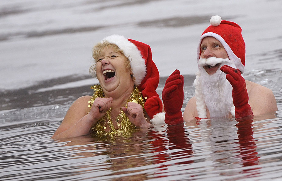 12月25日,德国柏林的冬泳俱乐部“柏林海豹”(Berliner Seehunde)的成员不畏寒冬,光着身子在已经结冰的Oranke湖中畅游一番。图片来源:中国新闻网