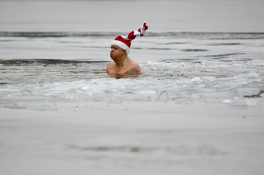 12月25日,德国柏林的冬泳俱乐部“柏林海豹”(Berliner Seehunde)的成员不畏寒冬,光着身子在已经结冰的Oranke湖中畅游一番。图片来源:中国新闻网