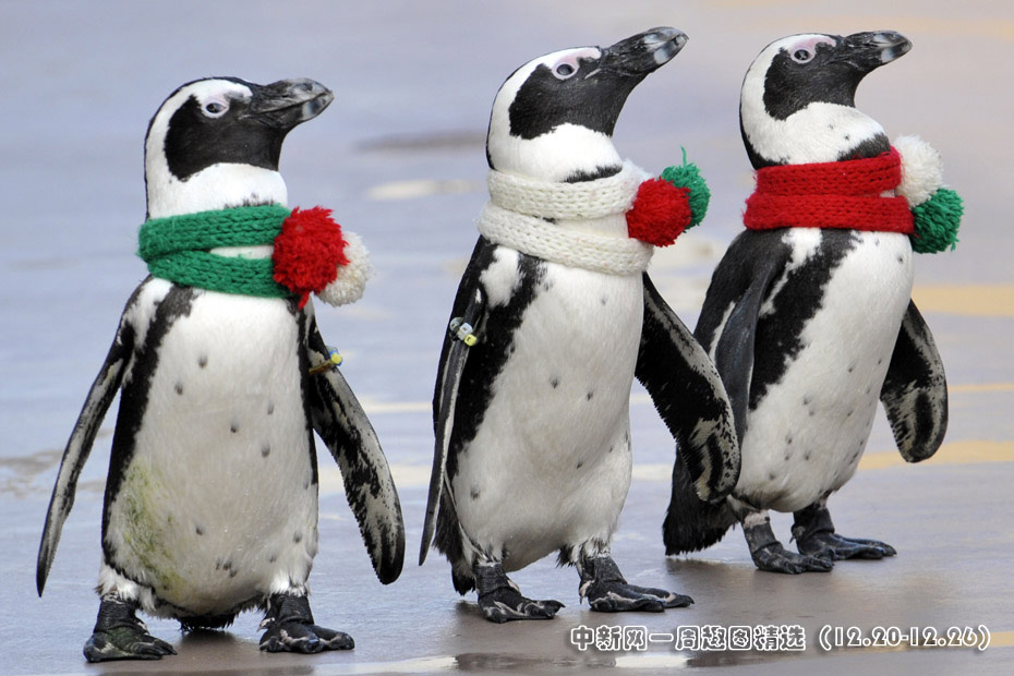12月24日,东京横滨八景岛海洋乐园的企鹅披着圣诞围巾在路边行走。图片来源:中国新闻网>>点击观看详细内容