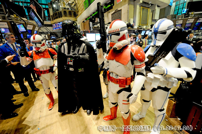 12月22日,为了纪念《星球大战》这个史诗般的影片,纽约证交所邀请了卢卡斯公司的行政人员以及《星球大战》中的角色来到纽约证交所,并为当日股市开盘。图片来源:中国新闻网>>点击观看详细内容