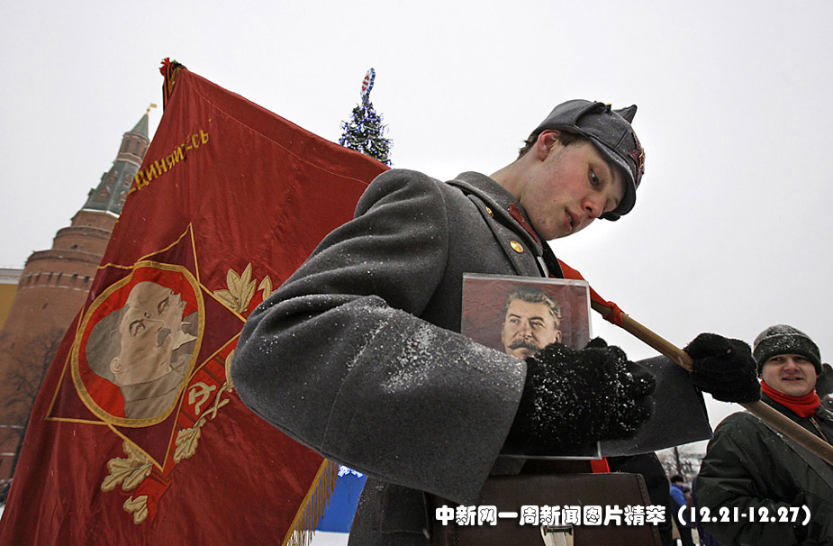 21日(周一),一名俄罗斯士兵手持斯大林肖像,等着向莫斯科红场上的斯大林墓敬献鲜花,以纪念这位前苏联领导人130周年诞辰。