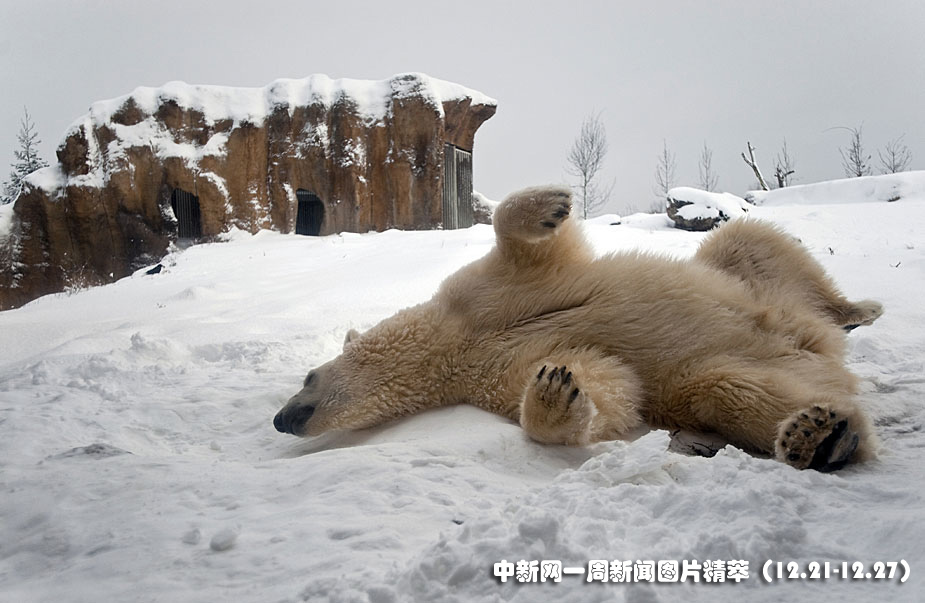 21日(周一),荷兰鹿特丹动物园内北极熊正在享受积雪所带来的乐趣。