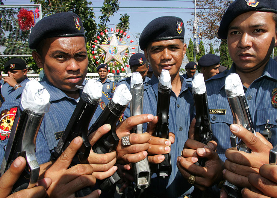 12月29日,菲律宾首都南部的塔吉格市警察部队为了防止警务人员在庆祝新年时胡乱开枪,下令用胶纸把枪口封起来。图片来源:中国新闻网
