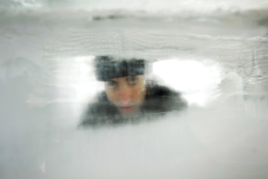 当地时间29日早上8点起,以色列魔术师赫齐·达扬在位于特拉维夫的拉宾广场上,达扬赤身进入一块8吨重的冰块里,开始了挑战冰屋生存世界纪录之旅。图片来源:中国新闻网