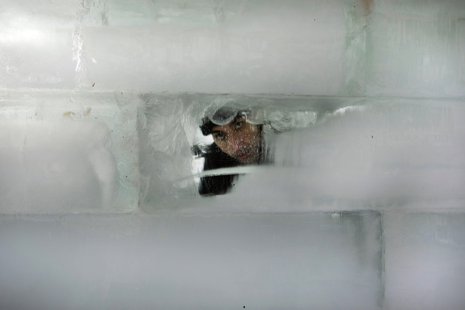 当地时间29日早上8点起,以色列魔术师赫齐·达扬在位于特拉维夫的拉宾广场上,达扬赤身进入一块8吨重的冰块里,开始了挑战冰屋生存世界纪录之旅。图片来源:中国新闻网
