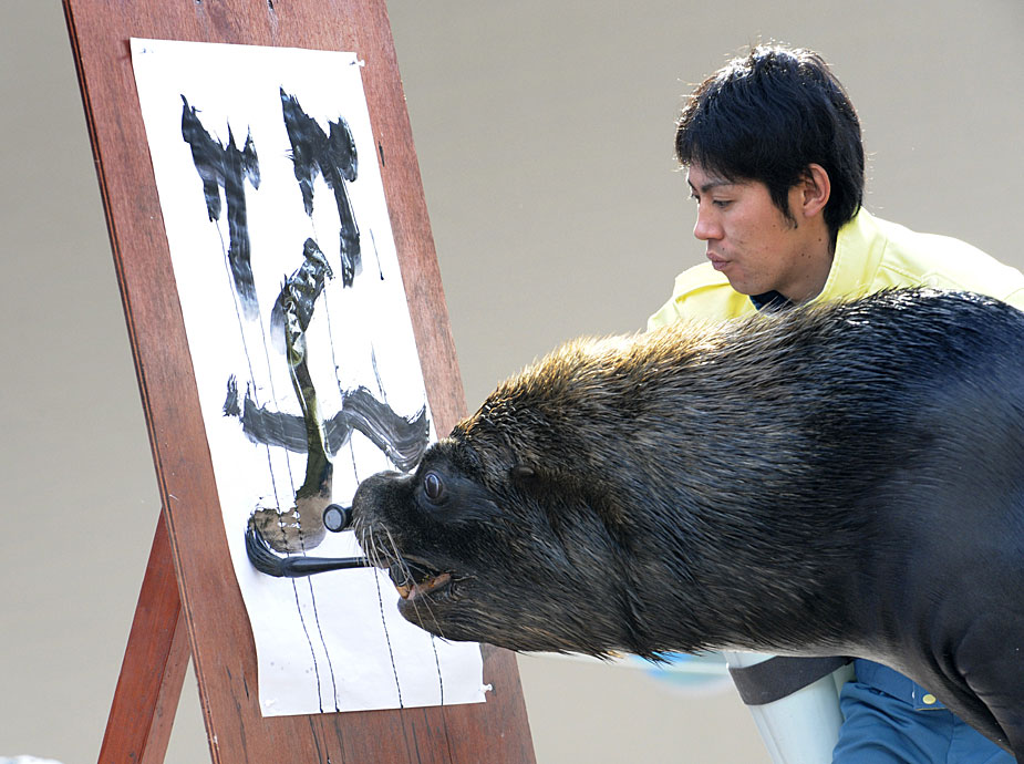 12月30日,日本神奈川八景岛海洋乐园水族馆内,海狮表演了用毛笔在纸上“写”汉字的节目。图片来源:中国新闻网