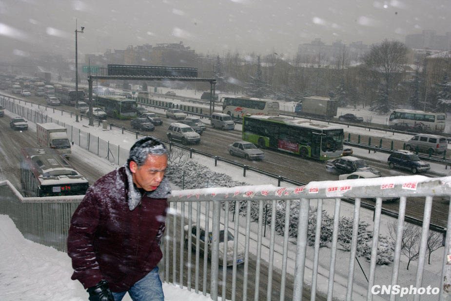 1月3日,北京城降下大雪,积雪深达6厘米,预计雪花会飘洒一整天。天气预报称,北京地区的气温有可能达到-16℃,从而逼近40年来的历史低温极值。图片来源:中国新闻网