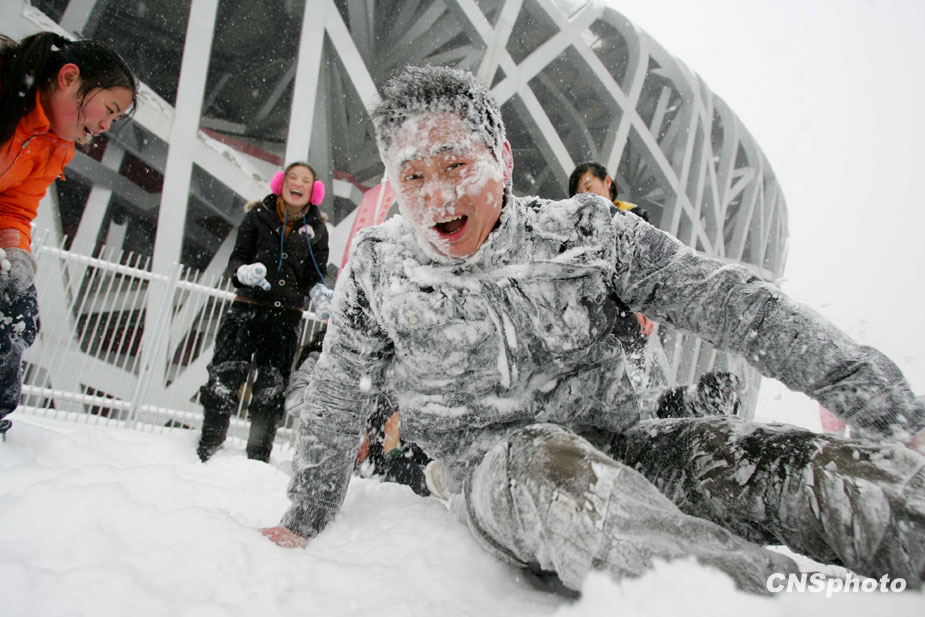 1月3日,北京城降下大雪,积雪深达6厘米,预计雪花会飘洒一整天。天气预报称,北京地区的气温有可能达到-16℃,从而逼近40年来的历史低温极值。图为年轻人在鸟巢旁打雪仗。中新社发 富田 摄