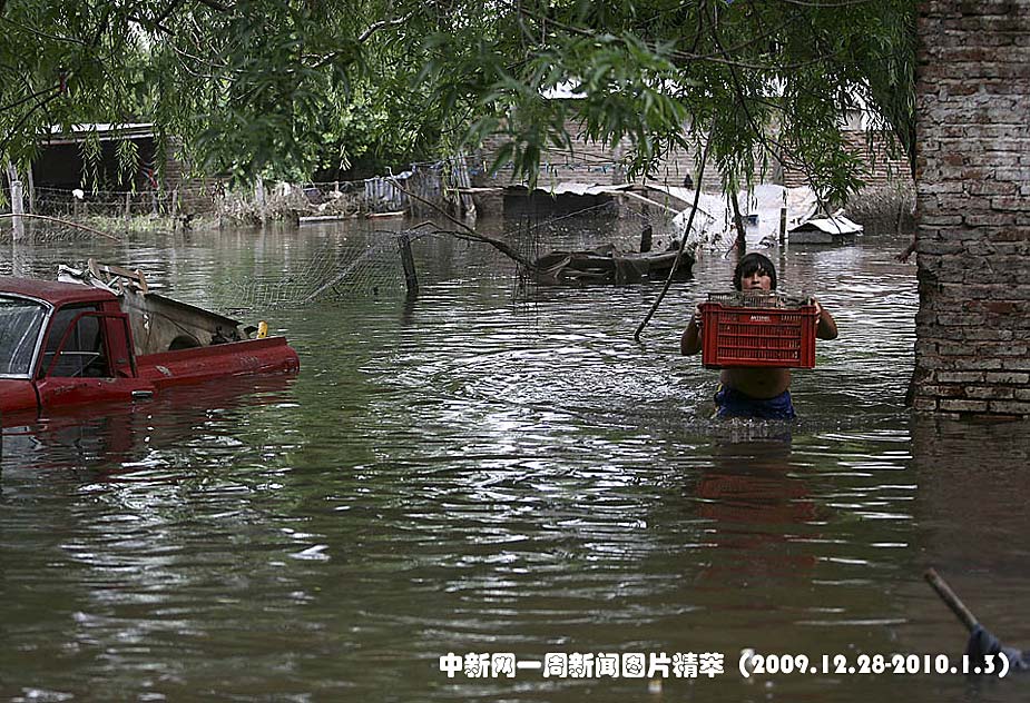 周一(28日)在阿根廷的圣安东尼.德.阿莱科,一名少年托着装有鸟的笼子在洪水泛滥的街道行走。阿莱科河沿岸的洪水已造成至少两人死亡,数千人被迫撤离。图片来源:中国新闻网