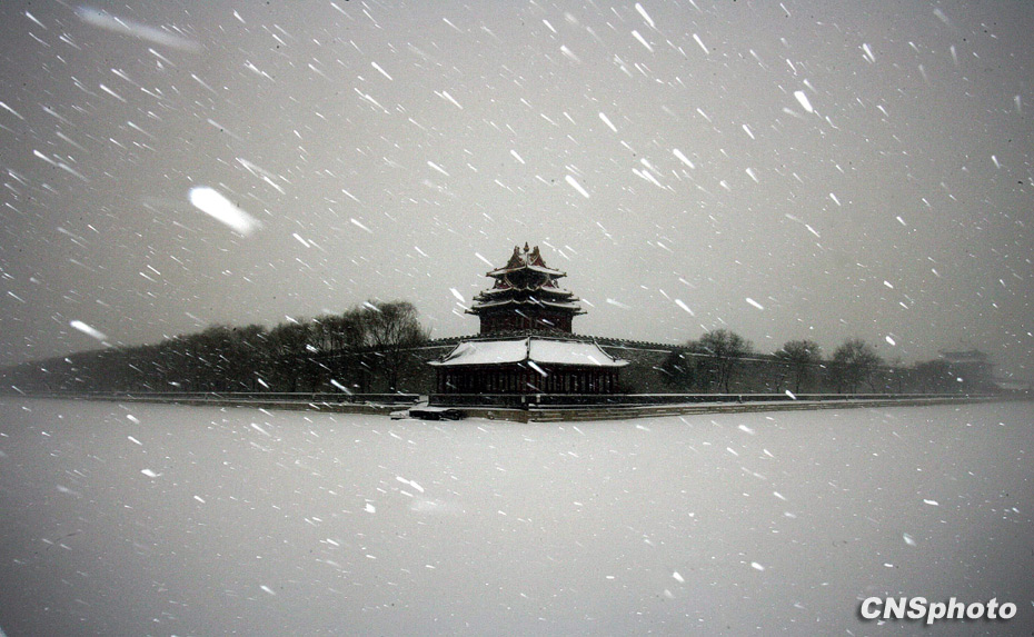 1月3日,大雪中的北京故宫角楼。