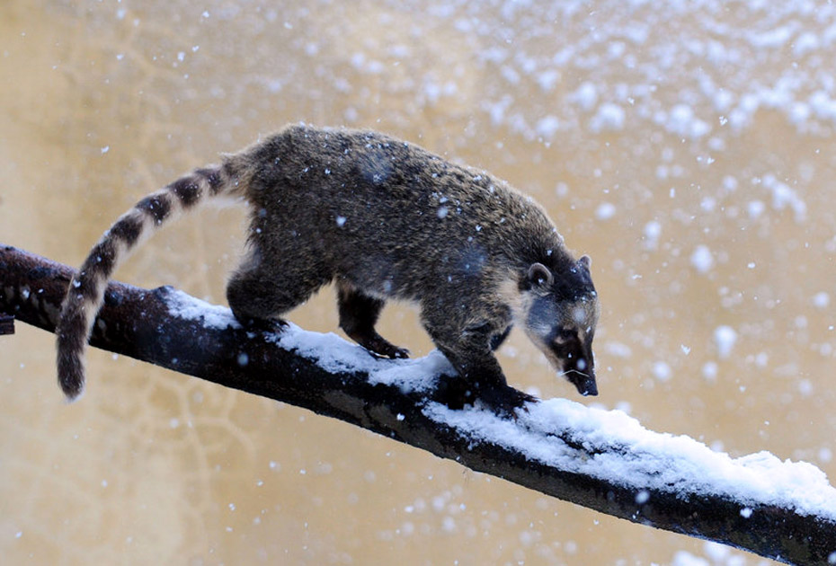 1月6日,伦敦动物园的小浣熊在享受难得的雪趣。barcroftmedia/CFP