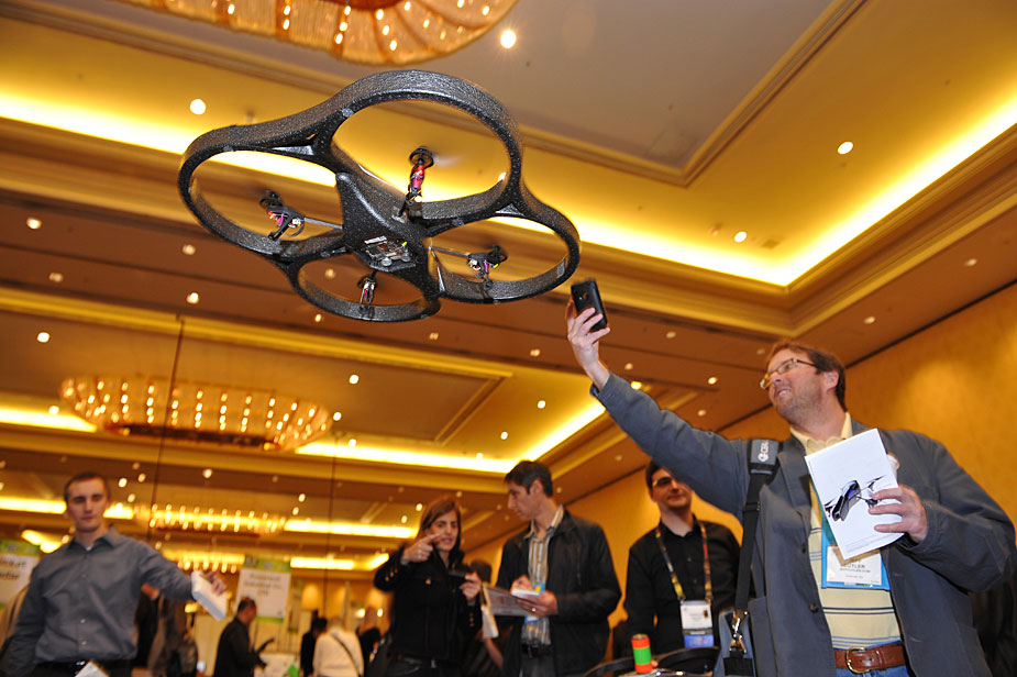图为国际消费电子展上展示无人驾驶直升机模型。