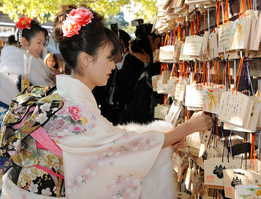 今年的1月11日,是日本传统的成人节,所有满20岁的年轻人将宣告自己迈进了成人行列。1月8日,日本一家公司年满20岁的年轻女孩纷纷穿上和服,到庙宇中祈福,提前庆祝成人节的到来。