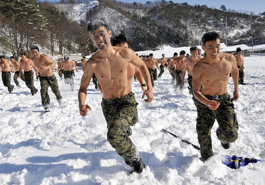 2010年1月8日,韩国特种部队在首尔以东约180公里的雪地上进行了冬季实地演练,官兵们赤膊上阵锻炼耐寒能力。图片来源:中国新闻网