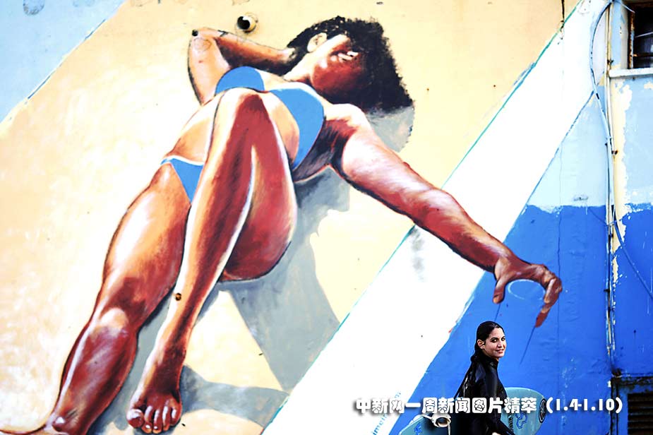 1月4日,(周一)在特拉维夫,一名女孩在地中海冲浪后走过一幅壁画。当日海浪最高达8英尺。图片来源:中国新闻网