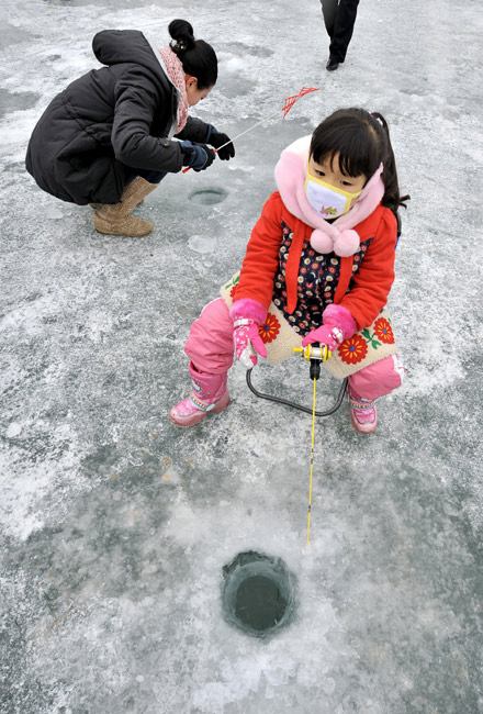 2010年1月9日,韩国华川郡,一年一度的华川山鳟鱼节当日举行。数千游客在此“破冰”比赛钓鲟鱼。该活动每年都会吸引上百万游客前来。