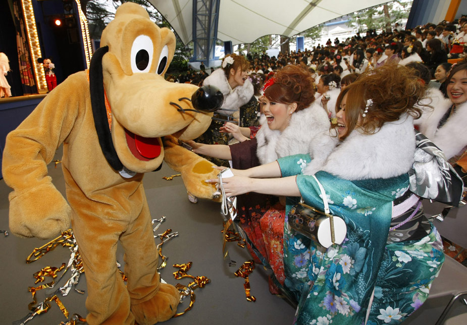 1月11日,日本迎来2010年的成人节日,所有年满20岁的年轻人都将在这一天宣告自己迈进了成人行列。众多年轻的日本女孩身穿和服在东京迪斯尼乐园里快乐游玩,迎接自己的节日。
