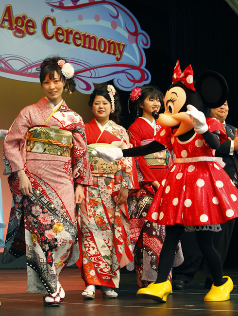 1月11日,日本迎来2010年的成人节日,所有年满20岁的年轻人都将在这一天宣告自己迈进了成人行列。众多年轻的日本女孩身穿和服在东京迪斯尼乐园里快乐游玩,迎接自己的节日。