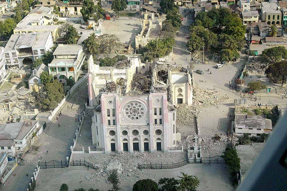 当地时间2010年1月14日,海地太子港,在地震中倒塌的教堂。
