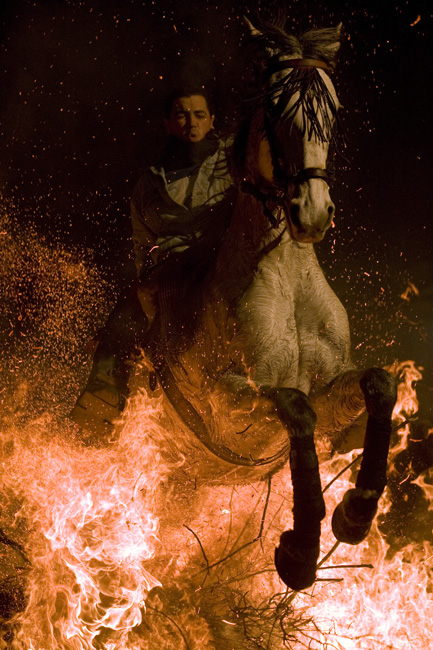 1月16日,西班牙一小村庄举行一年一度的圣安东尼赎罪节,勇敢的骑士们骑上心爱的坐骑穿过熊熊燃烧的火堆。 图片来源:中国新闻网