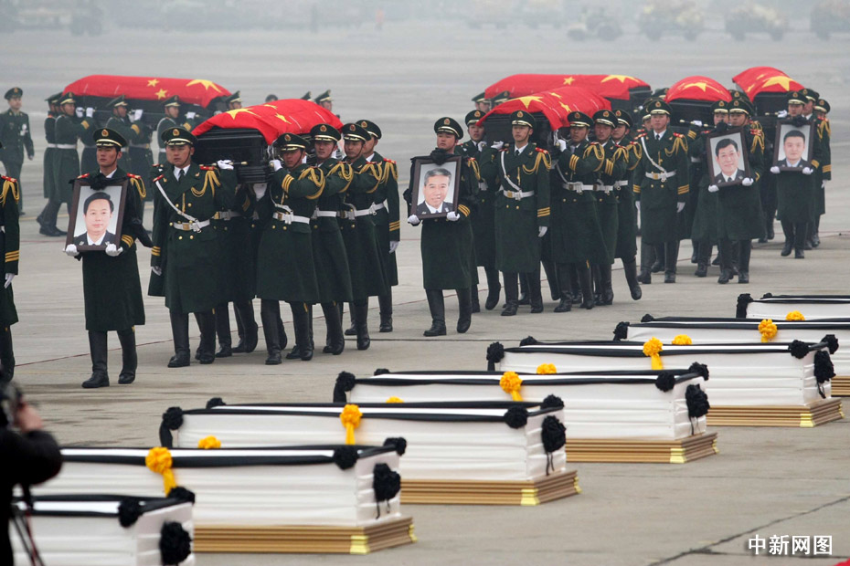 1月19日上午,在海地地震中牺牲的八位中国维和警察遗体回国接机仪式在北京首都机场举行。中新社记者 富田 摄