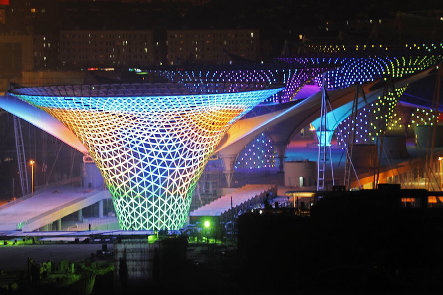 随着世博脚步临近,世博工地正热火朝天的加快施工进度,夜晚世博场馆演绎灯光秀。郭长耀/CFP